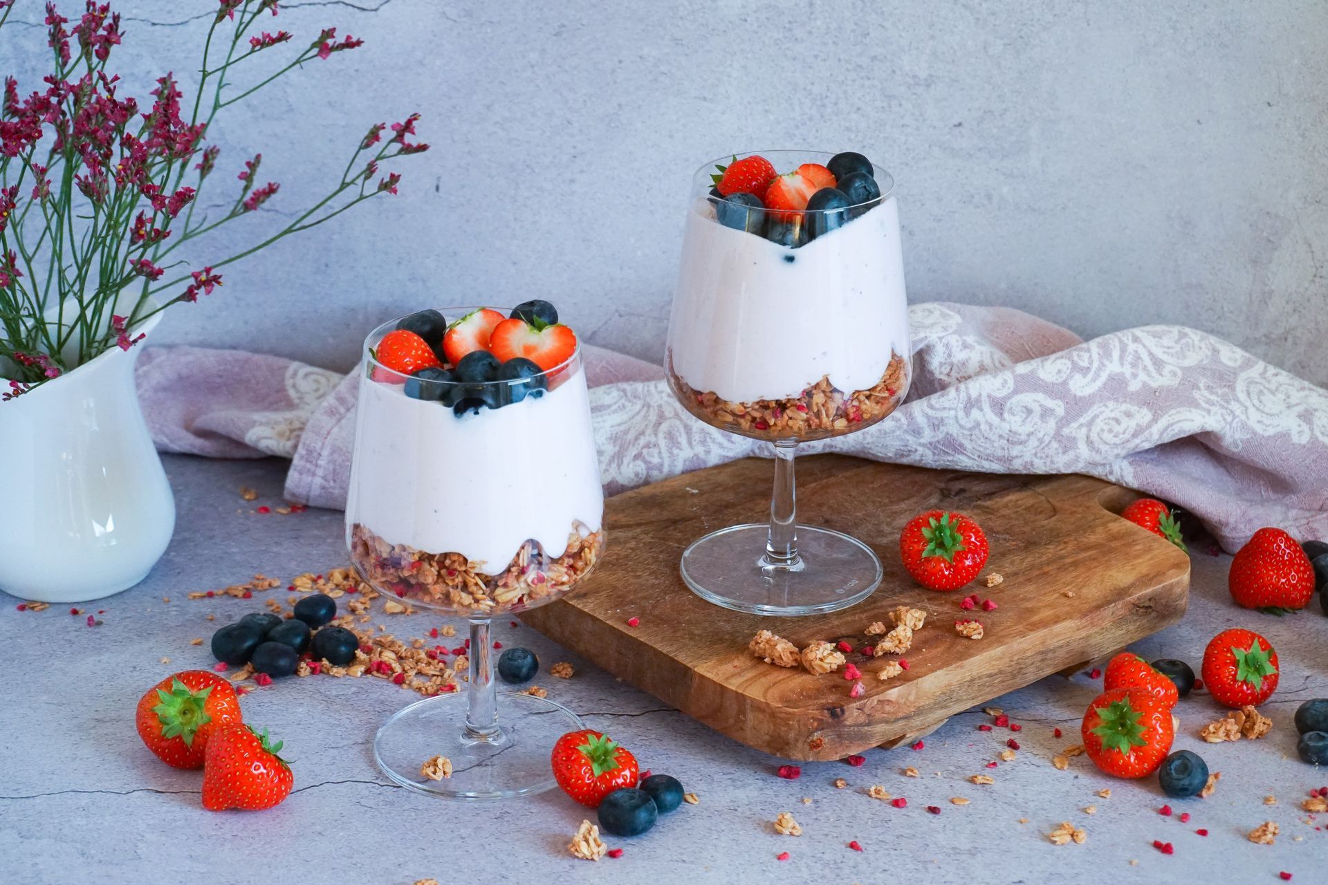 - Blandið skyrinu og rjómanum varlega saman og leggið blönduna ofan á granóla botninn. Kælið í 2 klst eða yfir nótt.