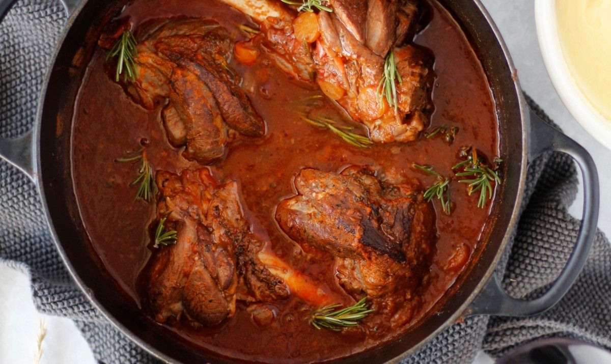 - Bætið 2 dl af bragðmiklu rauðvíni á pönnuna ásamt vatni, nautakrafti og kjúklingakrafti. Náið upp suðu og bætið svo lamba skönkunum út í ásamt ferskum kryddjurtum, setjið lokið á pottinn og leyfið að malla í 2 klukkutíma.