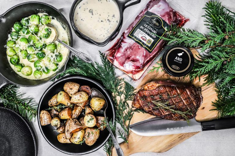 Franskar andabringur með steiktum kartöflum, kantarella sveppasósu og rósakáli með rjóma og parmesan. Gott er að bera öndina fram með t.d. waldorfsalati og það er algjört „must“ að steikja kartöflurnar upp úr andafitunni. Rósakál með rjóma og parmesan setur punktinn yfir i-ið og allt rennur þetta svo ljúflega niður með góðu rauðvíni.