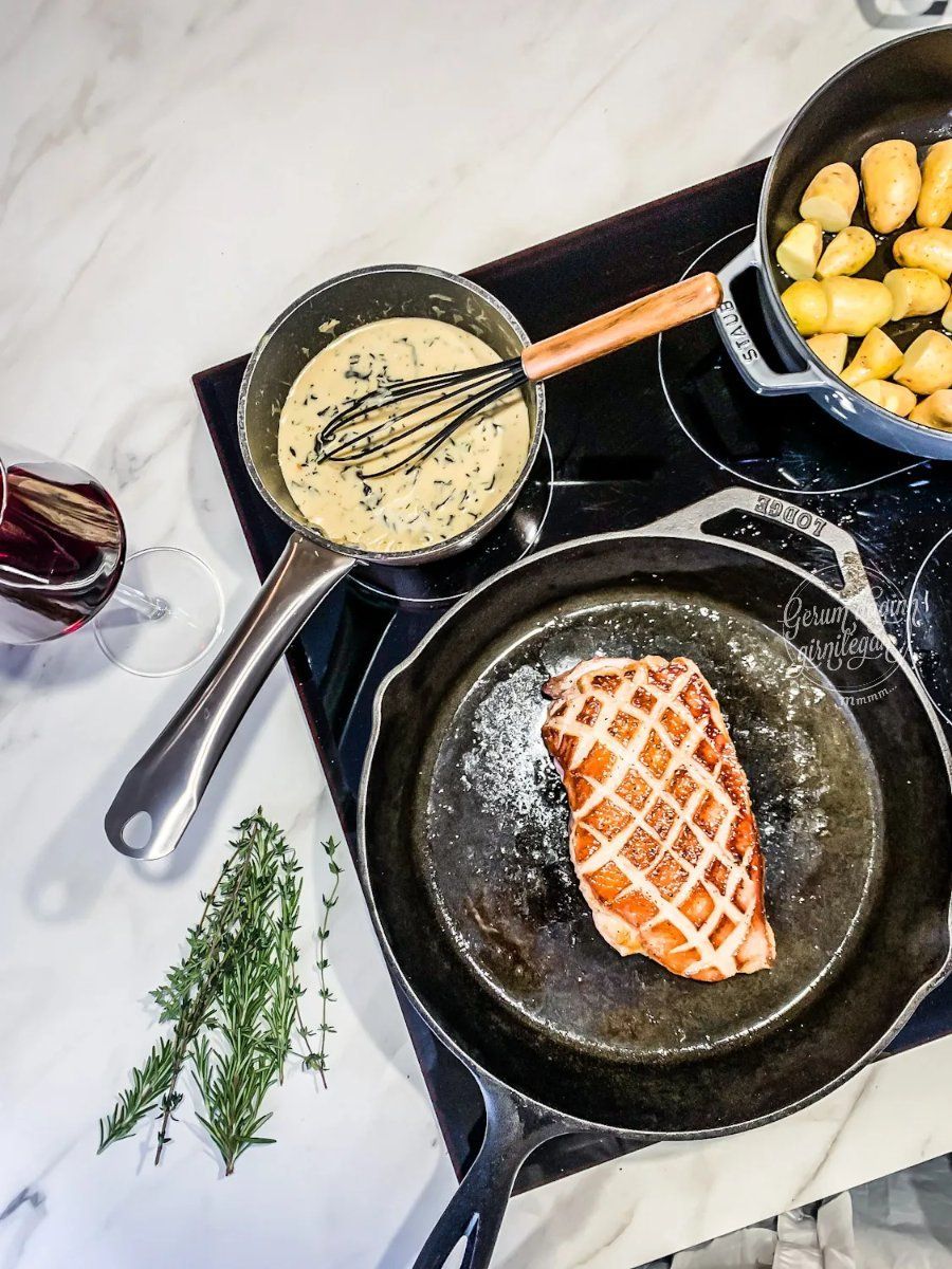 - Saltið og piprið eftir smekk. Setjið ferskt rósmarín og timían á andabringuna og klárið eldunina í ofninum í 12-15 mínútur við 180°C. Gott er að nota kjöthitamæli en kjarnhitinn á að vera 60 gráður. Andabringurnar mega alls ekki vera of mikið eldaðar því þá eru þær ekki góðar.