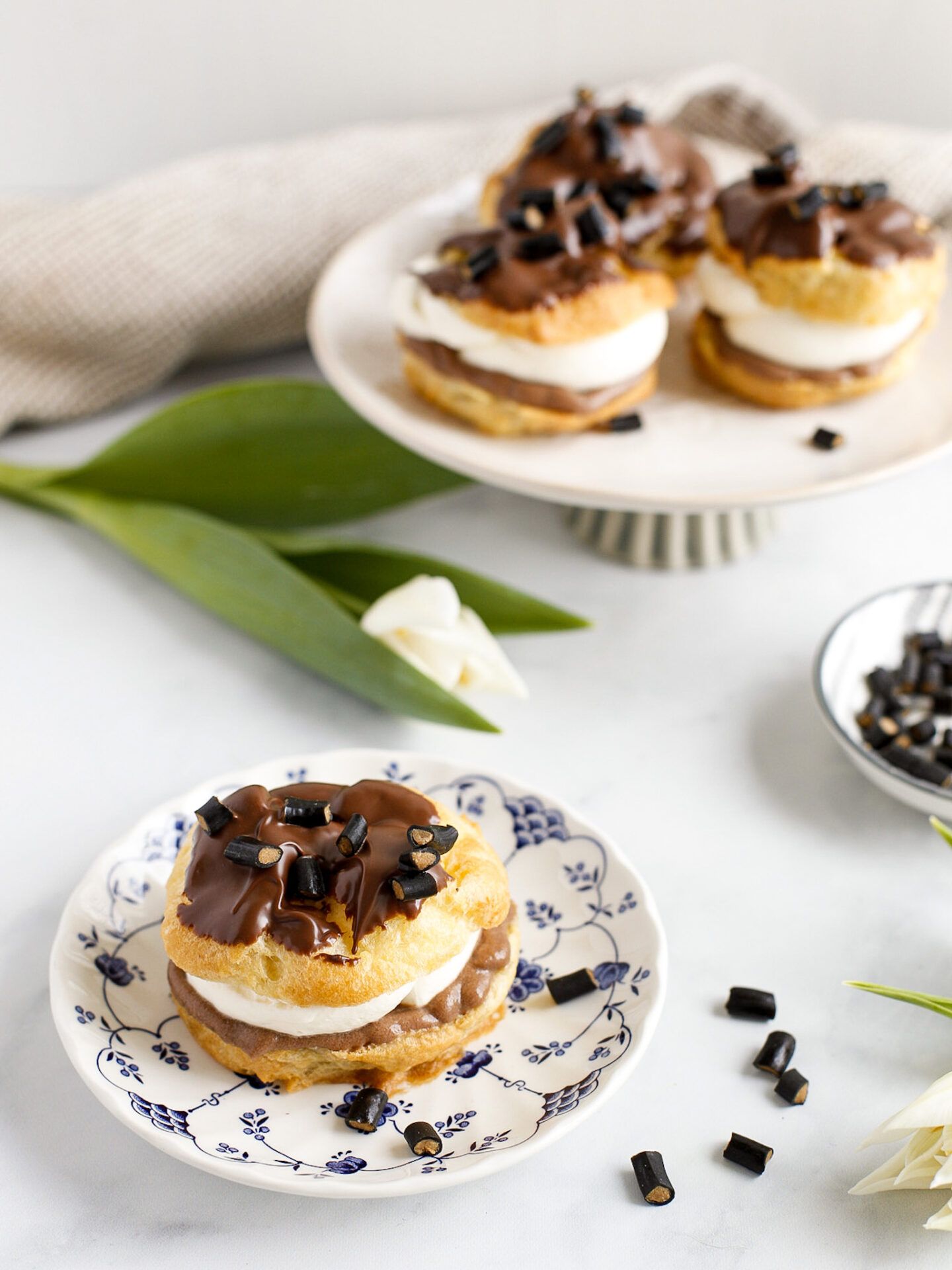 Stillið ofn á 180°c. Setjið vatn og smjör í pott og leyfið smjörinu að bráðna. Takið pottinn af hitanum og hrærið hveitinu saman við þar til deigið er orðið einn massi, kælið deigið örlítið. Setjið deigið í hrærivélarskál og bætið eggjunum út í einu í einu og hrærið vel á milli. Setjið deigið þá í sprautupoka og sprautið bollur á smjörpappírsklædda plötu, eða notið tvær teskeiðar til setja deigið á plötuna. Bakið í 18-20 mínútur. Ef þið viljið hafa bollurnar stærri þá er tíminn aukinn í samræmi við það.