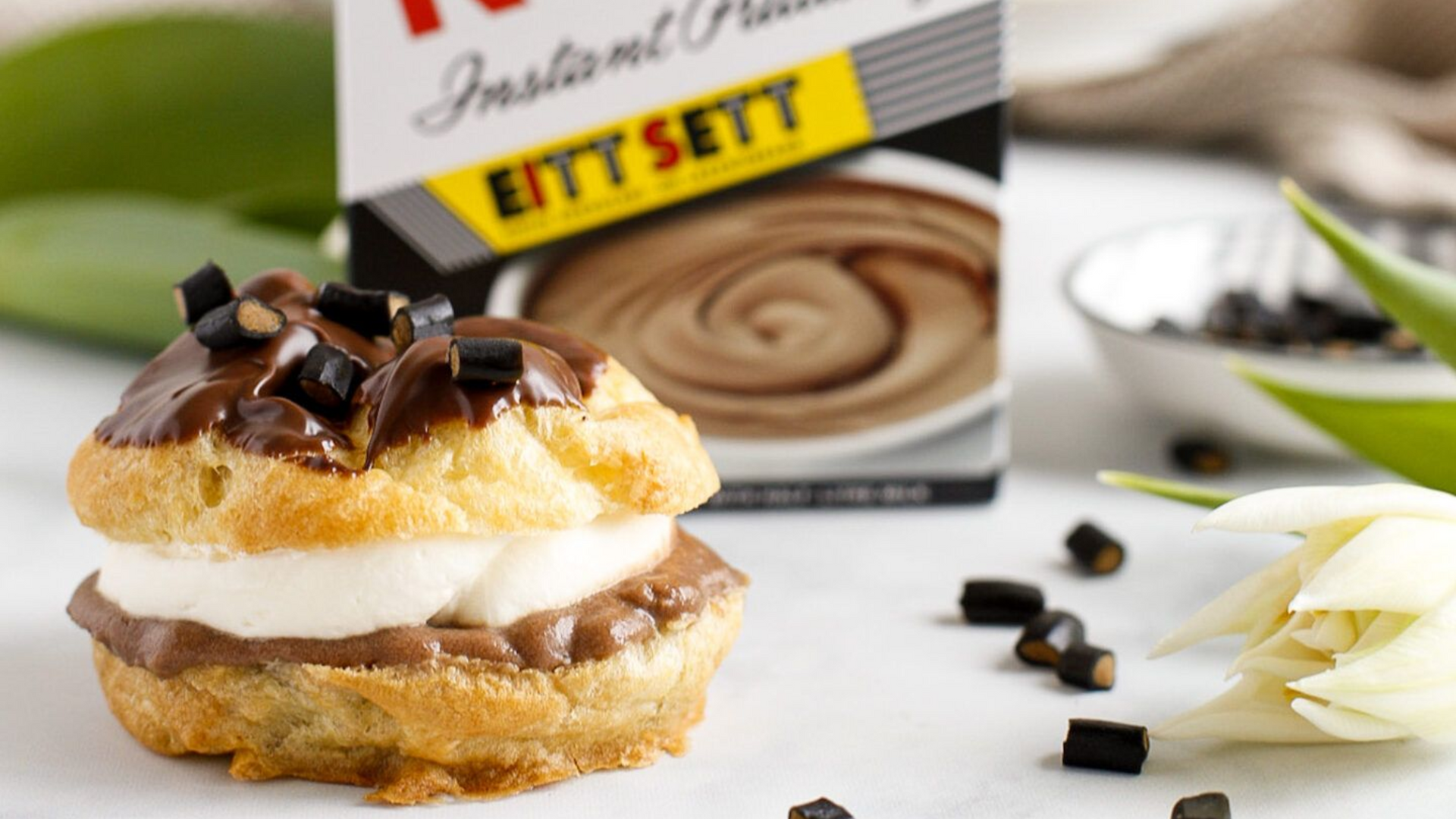 Blandið saman Eitt sett búðing með mjólk og hrærið vel saman, kælið. Þeytið rjómann og gott er að setja hann í sprautupoka en ekkert mál að setja á bolluna með skeið líka. Skerið niður lakkrís reimarnar í u.þ.b. cm bita.