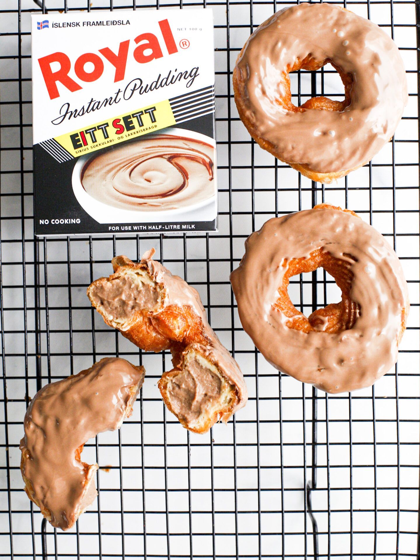 Útbúið búðinginn og kælið hann lítillega. Þegar hann hefur stífnað örlítið setjið hann í sprautupoka með stút á (ef þið eigið fyllingastút endilega notið hann). Sprautið þá búðingnum inn í vatnsdeigshringina á tveimur stöðum á botninum. Ef þið viljið er einnig hægt að bræða súkkulaði og dýfa hringjunum ofan í.
